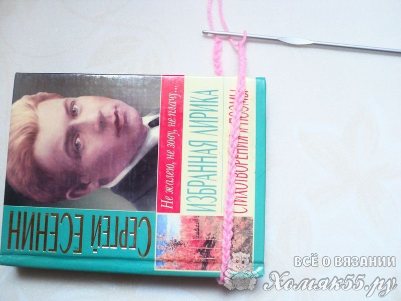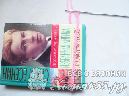 Чтобы связать такую обложку, мы сначала свяжем полотно нужного размера, а затем просто сошьем его в 4-х местах. Итак, берем книгу, обмеряем ее ширину, открыв ее. Такой длины вяжем первоначальную воздушную цепочку. И прибавляем еще несколько петель. Это зависит от размера книги. Эти петельки уйдут на сгиб обложки с обеих сторон.
