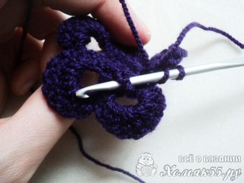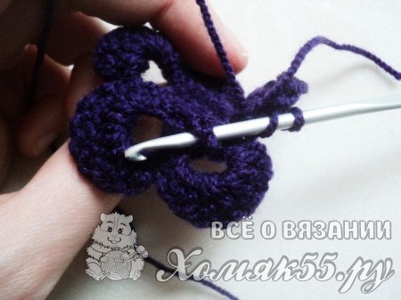 Теперь под арку вяжем 1 СБН, 3 ССН, 1 ПСН (полустолбик с накидом), 3 С2Н. Затем формируем 3 ВП. Теперь нам нужно повторить все то же самое, только в обратном порядке. То есть вяжем все под эту же арку 3 С2Н, 1 ПСН, 3 ССН и 1 СБН. Так мы обвязали лепесток.