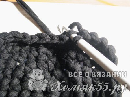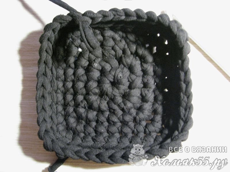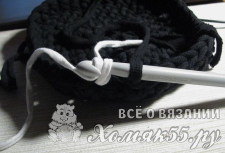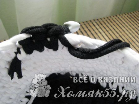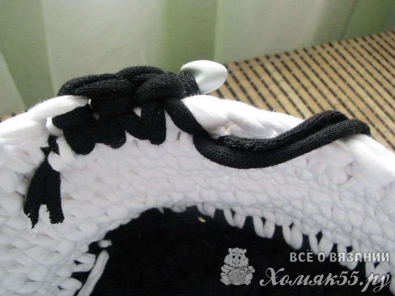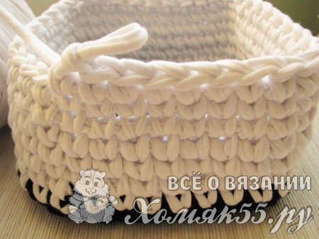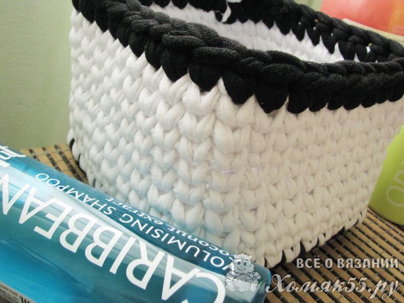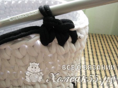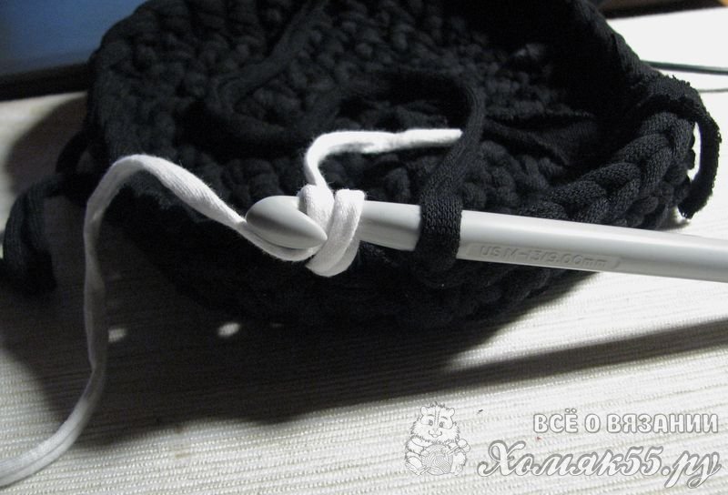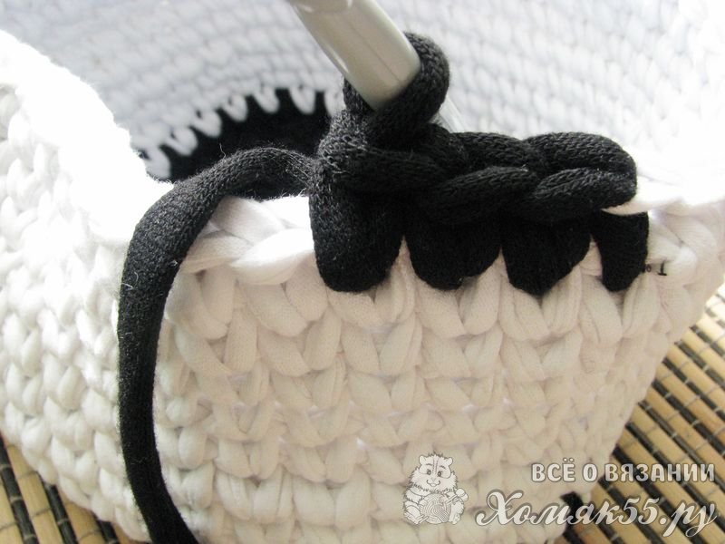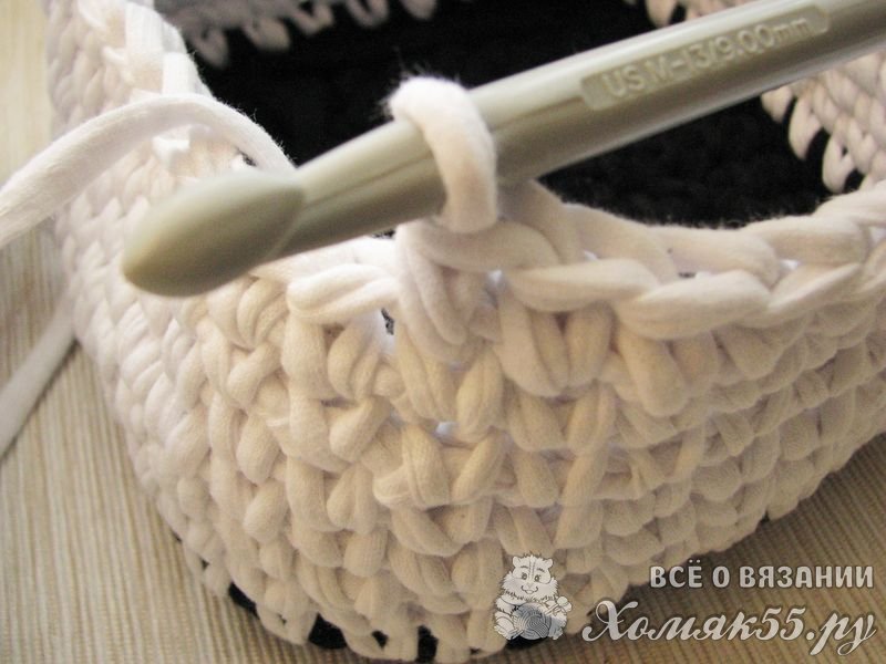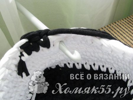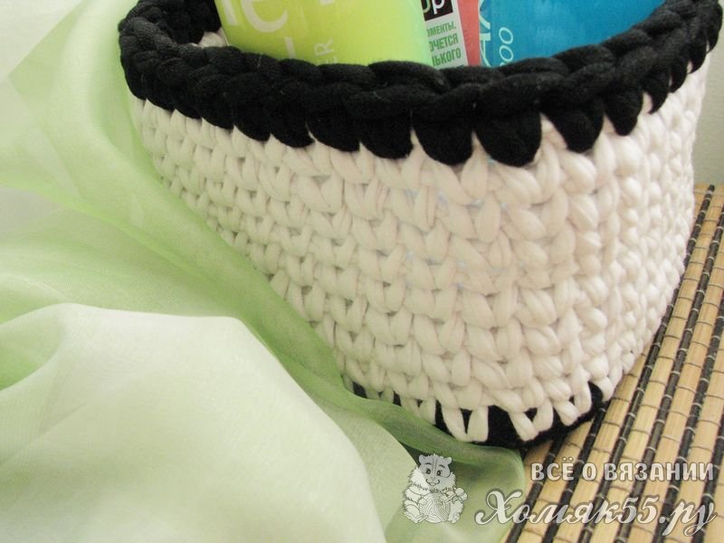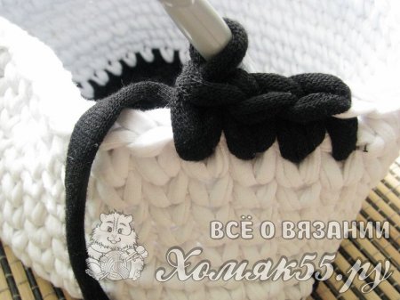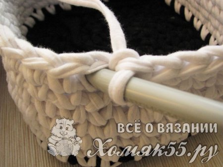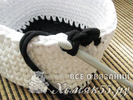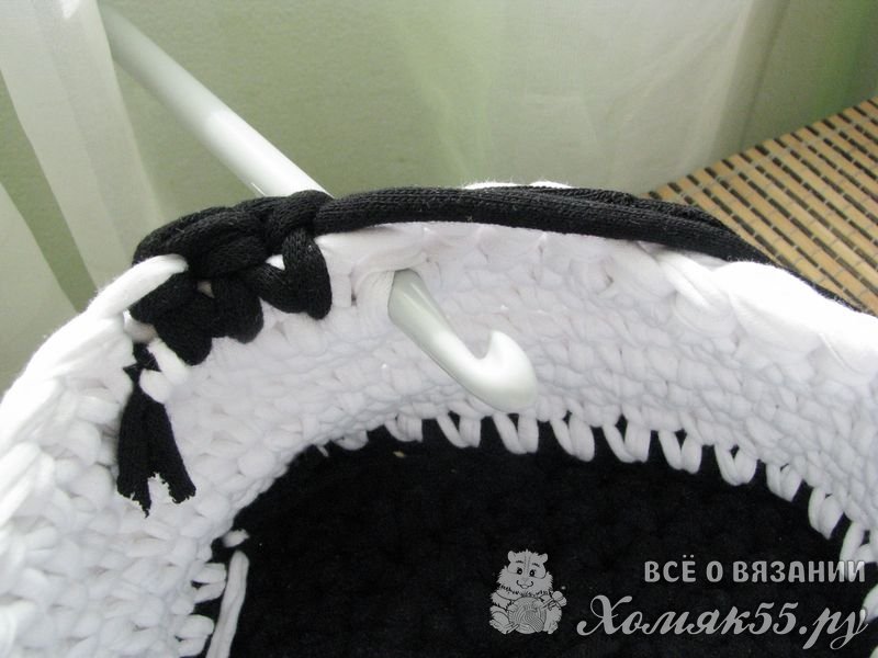 Таким образом, вяжите стенки корзинки до необходимой вам высоты, у меня провязано 8 столбиков, белой нитью и один заключительный столбик черной нитью.