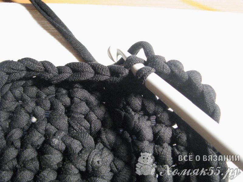Переходим с черной нити на белую. Для поднятия стенок, начнем ряд с воздушной петли, далее вывязывает столбики без накида, вводя крючок за заднюю стенку каждой петли, провяжите, таким образом, весь ряд.