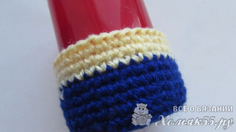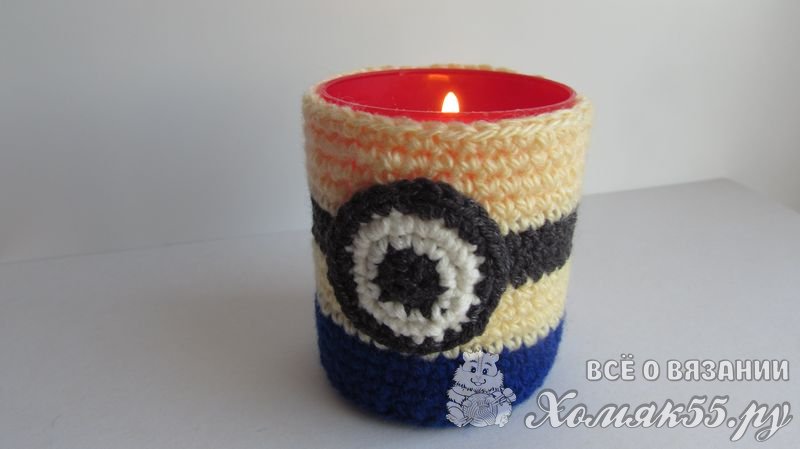 Затем снова вяжем 3-4 ряда из пряжи желтого цвета. Край основы должен совпадать с краем подсвечника.