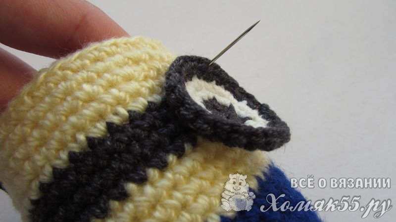 Пришиваем глазик к черной полоске на основе так, чтобы он располагался ровно посередине.