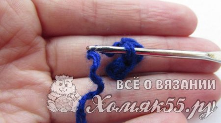 Теперь делаем 1 воздушную петлю для подъема и вводим инструмент в заднюю дольку первой от крючка петлю.