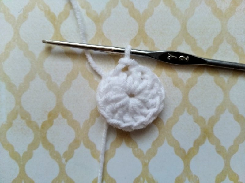 Вяжем по кругу 1 ряд ПСт СН. Вместо первого такого полустолбика делаем 2 ВП.
