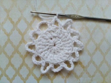Далее провязываем 11 Ст СН. И петельку затягиваем. Вяжем С Ст в 3 петельку воздушной цепочки, которую набирали в начале вязания ряда.