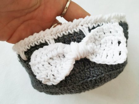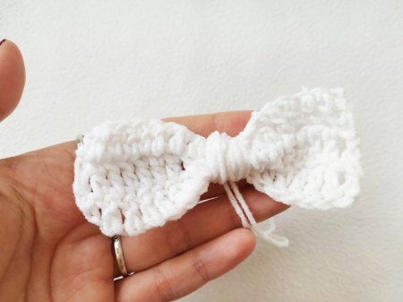 Корзиночка почти готова. Осталось ее украсить. Для этого просто свяжем бантик крючком. Ниткой белого цвета формируем цепочку из 20-25 петель. Далее делаем еще 3 петли и вяжем в 4 петельку от крючка 1 ст.с нак. Далее выполняем по 1 ст.с нак. разворотными рядами. Всего выполняем 3-4 ряда. Перематываем полотно по центру, формируя бантик.