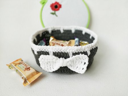 Корзиночка для конфет крючком готова! Ее лучше накрахмалить, чтобы она держала нужную форму.