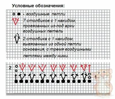 Крючком по схеме, приведенной ниже, вяжется цветок. Когда будет готова ажурная полоска (базовая часть), закручивается вокруг центра и мелкими стежками закрепляется на изнанке.
