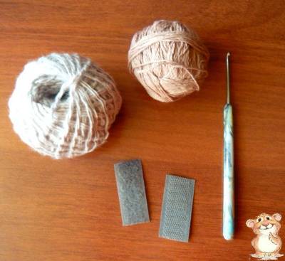 Для работы понадобится пряжа в тон занавесок (25 г на один цветок) и пряжа контрастного цвета (5 г), полоска-липучка (3 см), вязальный крючок под толщину ниток, швейная иголка и нитки в тон цветка.