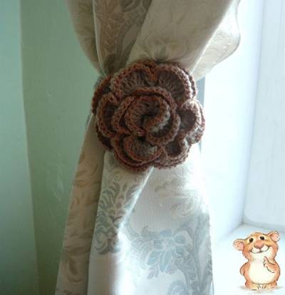 Аккуратно собрать полотно штор поможет цветок-прихват. Можно купить специальный аксессуар на магнитах, но для тех, кто умеет вязать крючком, сделать его своими руками не станет проблемой.