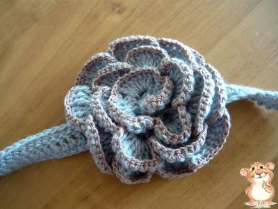 Набрать 45 воздушных петель. На них провязать последовательно ряд столбиков без накида, ряд столбиков с накидом, и третий ряд – столбики без накида. Нить отрезать. * Петель может быть набрано больше или меньше: все зависит от толщины собранного вместе полотна, от толщины вязальных ниток и плотности вашего вязания.Ленты-липучки выпускаются разных цветов. Можно подобрать что-то максимально подходящее к вашей работе. Для одного цветка достаточно 2-3 см ленты.