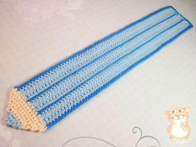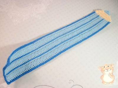 Далее провязываем ряд за рядом СБН так, чтобы по краям было всегда по 2 СБН с одной вершиной. За счет этого убавления и формируется форма верхушки карандаша. В конце меняем нить на голубой цвет и довязываем аналогичным образом кончик карандаша.