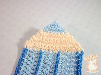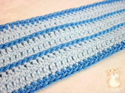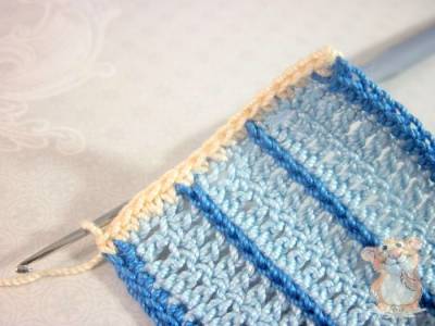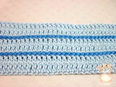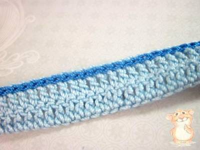 Провязываем еще 1 ряд ССН. 3-й ряд провязывается с помощью пряжи другого цвета и с помощью СС.