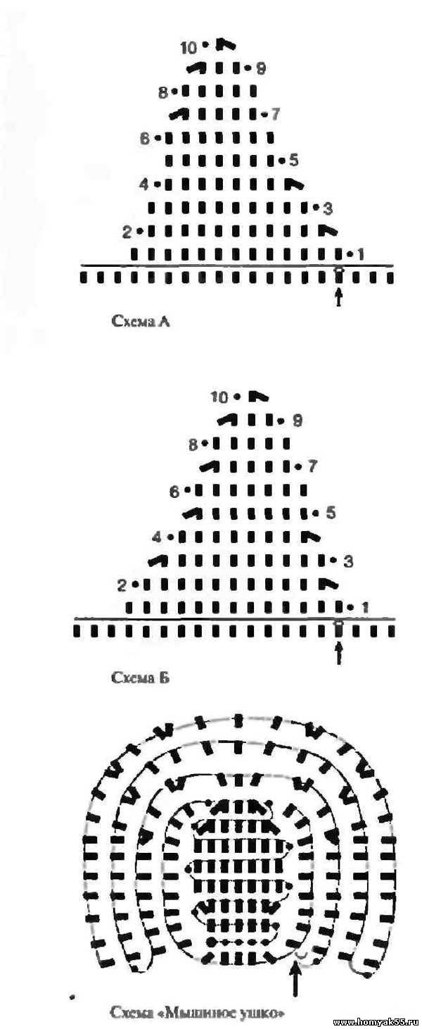 Ушки вязать но схеме последовательными рядами. Под линией даны некоторые петли 20-го круга. Начать левое ухо кошки на 22-й петле перед петелькой, вязать но схеме А. Правое ухо кошки начать на 10-й петле после петельки, работать но схеме Б.