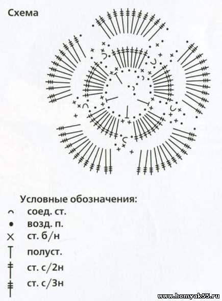1. Свяжите светлой нитью 7 цветов по схеме следующим образом: 1-й ряд лепестков С2Н, 2-й ряд лепестков С3Н, 3-й ряд основание для второго ряда лепестков, прикрепляйте между лепестками первого ряда.$CUT$
