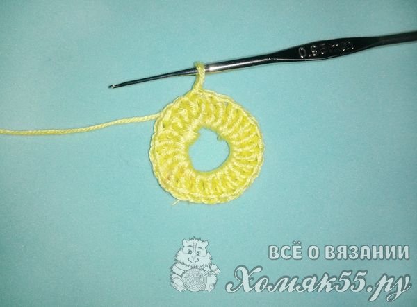 Теперь снова набираем три воздушные и в образовавшееся колечко вяжем двадцать три столбика с накидом. Начало и конец ряда мы соединяем.