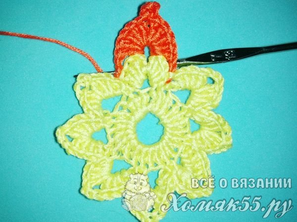 Далее мы нитку заменим на оранжевую. И продолжим вязать. Прикрепляем нитку к соединительному столбику и делаем две петли. Вяжем в арку пять столбиков с накидом.