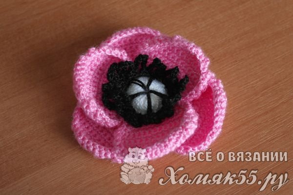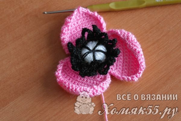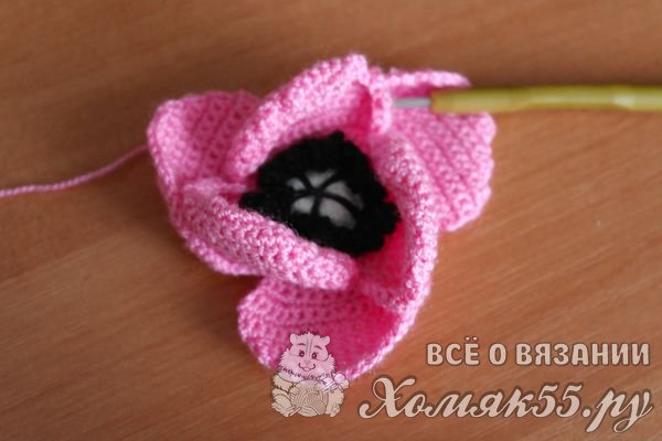 К этому ряду будем постепенно навязывать лепестки мака. Вяжем лепестки столбиками без накида, поворачивая вязание то в одну, то в другую стороны.