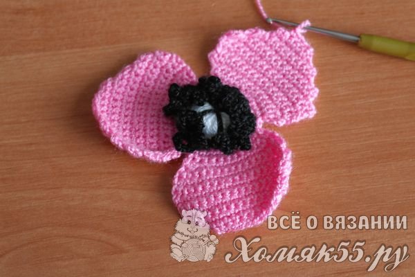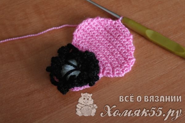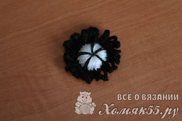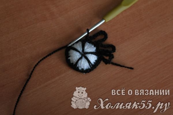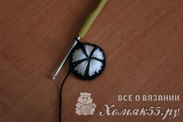 Черной нить обвязываем серединку по контуру, не забывая при этой несколько раз продеть ее через центр серединки.