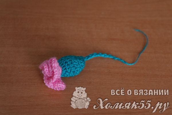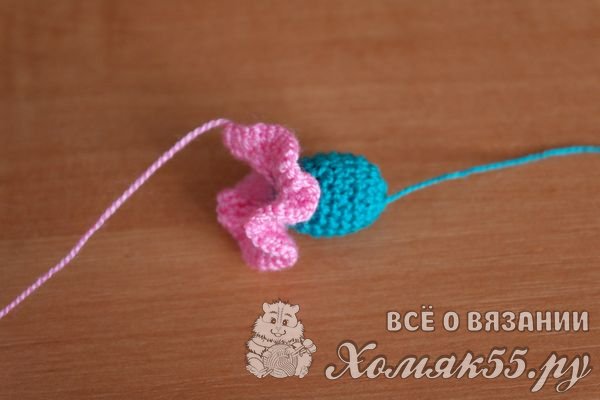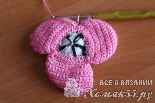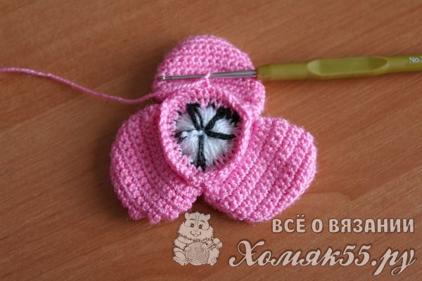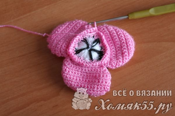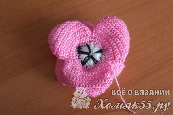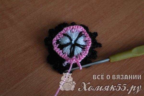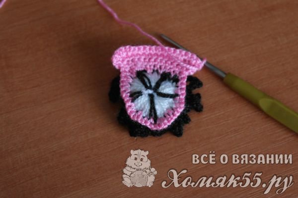Теперь вяжем круговой ряд по изнаночной стороне цветка розовой нитью.
