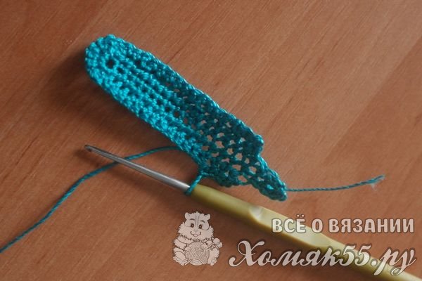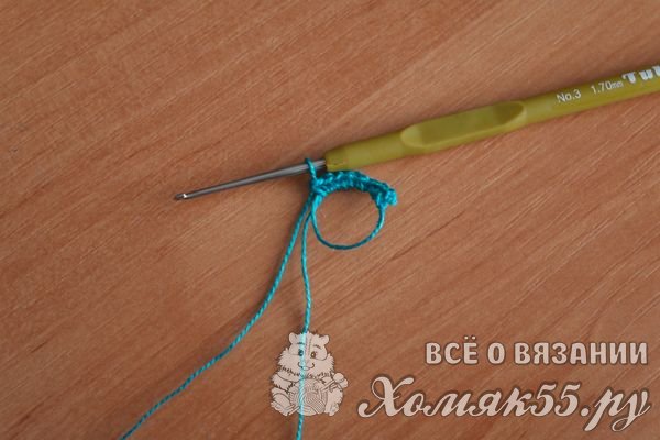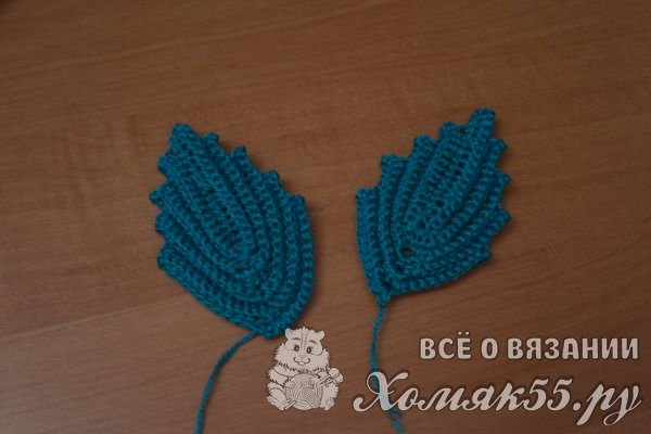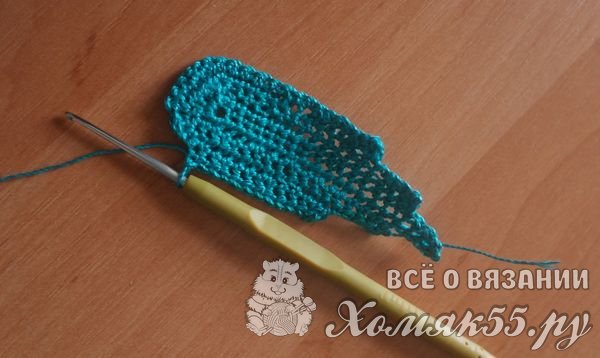 Вяжем листочки. Их 15 воздушных петель вяжем цепочку и обвязываем ее по кругу столбиками без накида.