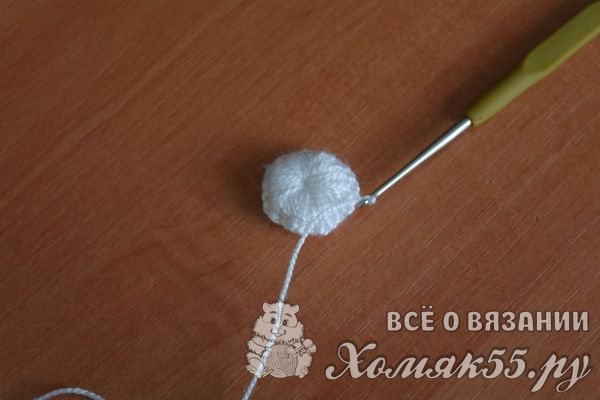 А затем вяжем 10 воздушных петель и крепим их к следующей петле основания, снова вяжем 10 воздушных петель и снова крепим их. И такие воздушные цепочки-лепестки вяжем по всему контуру серединки.