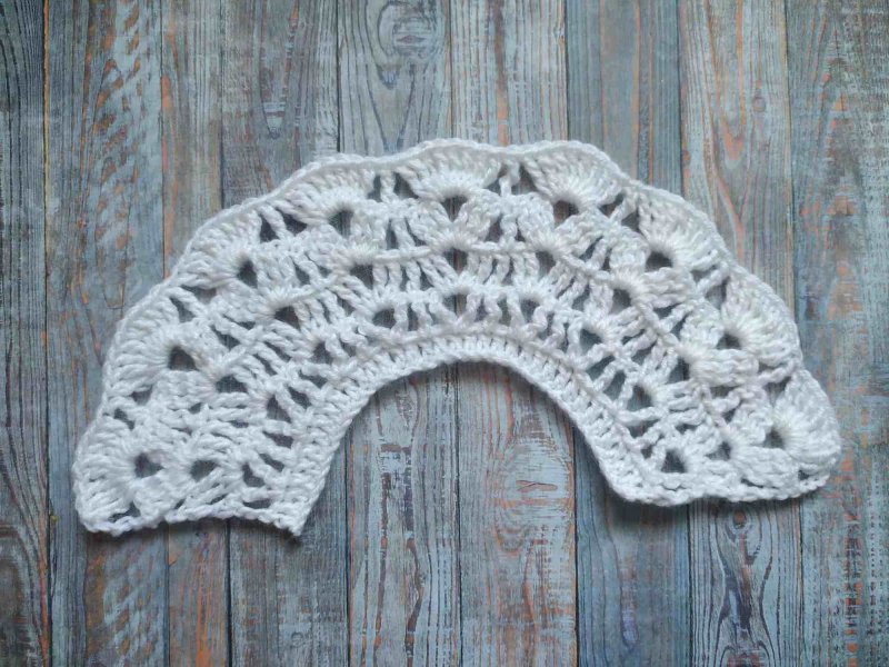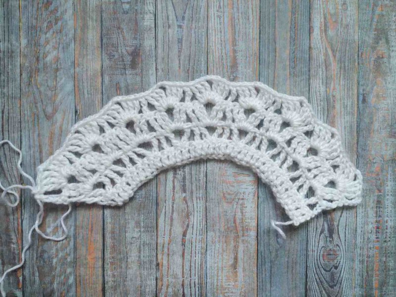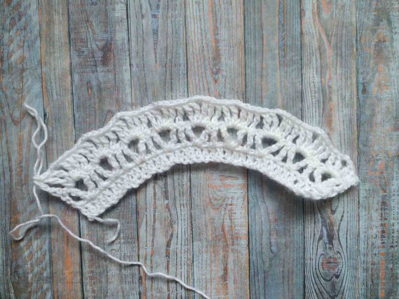 В следующем ряду вяжем почти так же, как вязали в предыдущем. Но здесь под воздушные петли провязываем 3 столбика с 2 накидами, 2 воздушные петли и 3 столбика с 2 накидами. В одиночный столбик также вяжем 1 столбик с 2 накидами. Вяжем так до конца этого ряда.