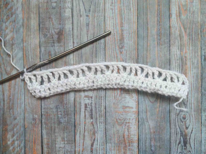 Теперь развернем вязание и сделаем 4 воздушные петли. Пропускаем 1 петлю в основании и вяжем 1 столбик с 2 накидами, делаем 2 воздушных петли и вяжем еще 1 столбик с 2 накидами. Пропускаем снова петельку и вяжем 1 столбик с 2 накидами. Вновь пропускаем петлю и вяжем 1 столбик с 2 накидами, 2 воздушных петли и 1 столбик с 2 накидами. Все вяжем в одну петельку. Так продолжаем чередовать вязание до конца ряда.