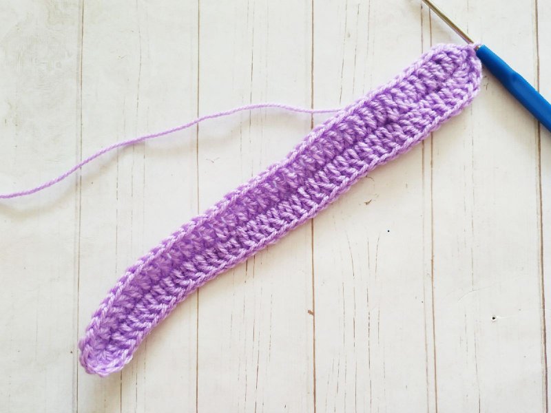 Теперь свяжем ремешок. Складываем 2 цвета нити вместе. Присоединяем петлю в уголок и набираем нужное количество петель. Затем выполняем вниз по 1 сс.