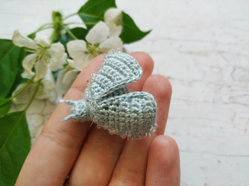 Украсить крылышки можно бисером. Пришиваем его при помощи бисерной иголочки. Бисер можно выбрать под цвет пряжи или использовать прозрачный. Также будет хорошо смотреться бисер чуть темнее основного цвета мотылька.