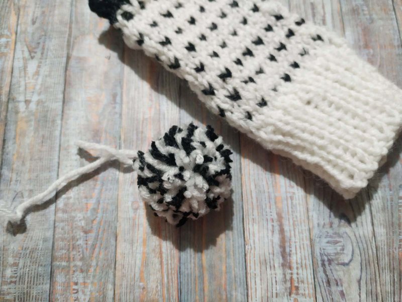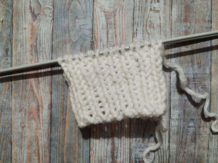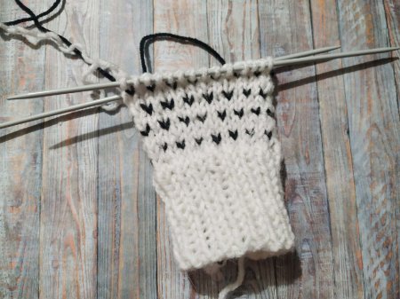 Затем провяжем 2 ряда лицевой гладью, выполняя только лицевые петли. Теперь потребуется черная нить. В следующем ряду продолжаем вязать лицевую гладь, но теперь чередуем цвет нити. 1 петля белая, 1 черная. И так весь ряд.