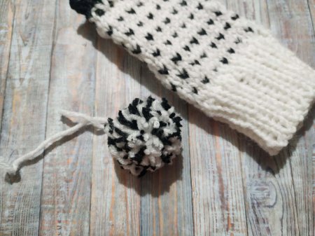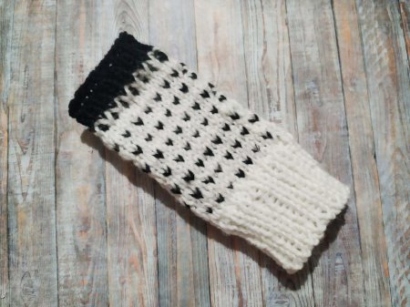 Вяжем примерно до середины мизинца. Затем белую нить фиксируем и обрезаем. Вяжем только черной ниткой несколько рядов резинкой один на один.