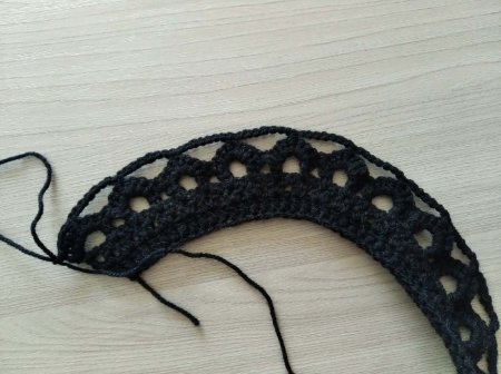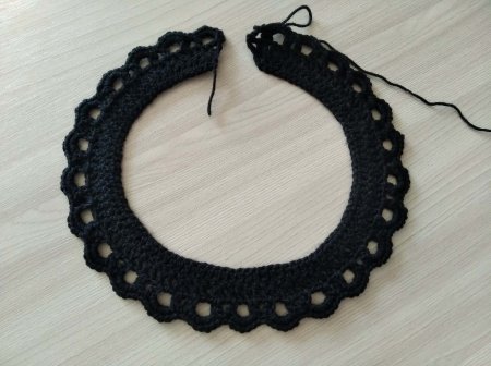 Теперь будем провязывать 1 СтСН, 1 ВП и 1 СтСН в петельку, а следующую петелечку пропускаем. И повторяем все снова. Второй ряд воротничка закончен.