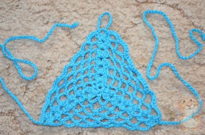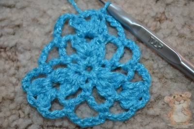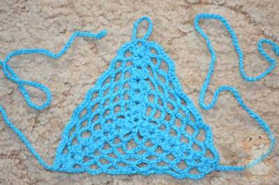 Четвертый шаг. Пользуясь вышеописанной схемой провяжем весь ряд по кругу и получим деталь, похожую по форме на треугольник.