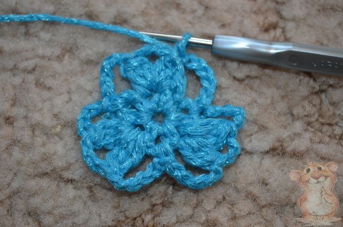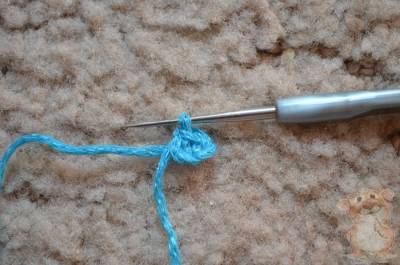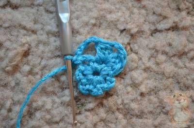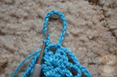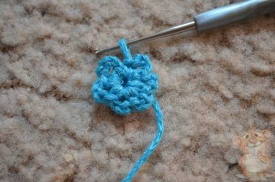 Второй шаг. В следующий ряд будем вязать арочками, каждая из которых должна состоять из трех воздушных петель и прикрепим их к кольцу с помощью столбиков без накида. Всего таких арочек должно получиться по кругу шесть штук.
