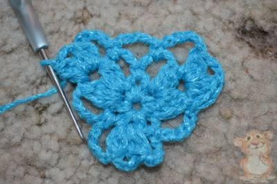 Третий шаг. В третьем ряду их первой арочки вывяжем три столбика с одним накидом и соединим их в одну петлю. Затем провяжем еще три таких же столбика с одним накидом соединенных одной петлей из той же арочки, после чего вывяжем цепочку из пяти воздушных петель и прикрепим ее с помощью одного столбика без накида к центру следующей арочки.