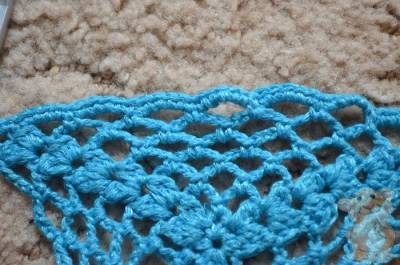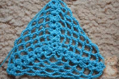 Седьмой шаг. Далее провяжем еще четыре ряда в той же технике, при этом увеличивая число арок между парой тройных столбиков на одну. Провязав от начала вязания шесть рядов, у нас получится ажурная деталь в форме треугольника.