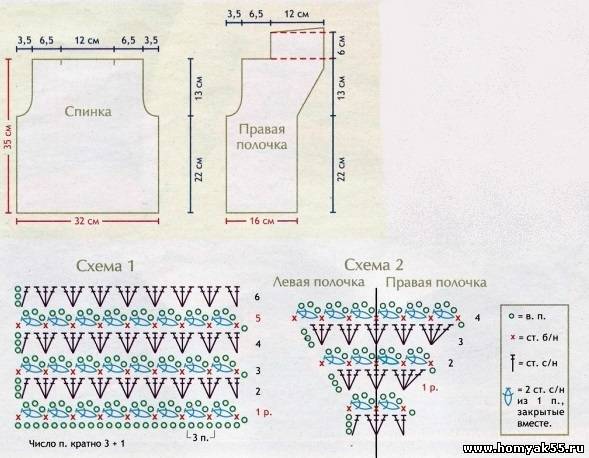 Набрать цепочку из 58 ВП и вязать основным узором по схеме 1. На высоте 22 см закрыть для пройм с обеих сторон в каждом ряду 3 петли, 2 петли и 1 петлю. На общей высоте 35 см закончить вязание.Правая полочка