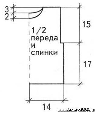 Наберите нитью табачного цвета 70 петель и вяжите 4 см резинкой 2 х 2. Далее вяжите жёлтой нитью лиц. гладью. На высоте 17 см от начала вязания закройте для пройм с обеих сторон по 6 петель и вяжите ещё 12 см ровно. Закройте средние 22 петли и далее обе стороны вяжите отдельно. Для закругления выреза горловины закройте в след. 2-м ряду 1 раз 1 петлю. На высоте проймы 15 см все петли закройте. Вторую сторону довяжите симметрично. $CUT$Перед