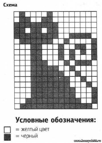 По плечам на спинке наберите петли жёлтой нитью и вяжите 2 см резинкой 2 х 2. По плечам передней части наберите петли нитью табачного цвета и вяжите 2 см резинкой 2 х 2, при этом выполните на каждом плече (ближе к горловине) по 1 отверстию для пуговиц (2 петли вместе, накид). Выполните боковые швы, сшейте короткие стороны резинок на плечах по краям. Обвяжите вырез горловины и пройм «рачьим шагом» нитью табачного цвета. На передней части выполните вышивку котёнка чёрной нитью швом «петля» по схеме.Журнал "Копилка вязаных идей для детей", 2012