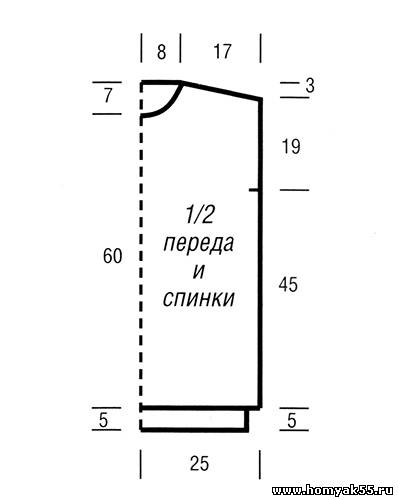 Набрать 53 петли и связать 5 см резинкой, равномерно прибавив в последнем ряду 9 петель = 62 петли. Затем петли распределить следующим образом: 1 кром. петля, 3 петли изн. глади, 24 петли узора с косами, 6 петель рельефного узора, 24 петли узора с косами, 3 петли изн. глади, 1 кром. петля. Через 64 см = 90 рядов от резинки закрыть для скосов плеча с обеих сторон 7 петель и в след. 2-м ряду 1 х 7 петель. Через 67 см = 94 pяда от резинки оставшиеся петли закрыть.