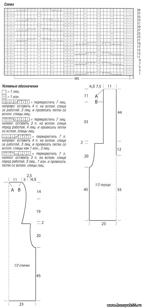 Узор с косами: вязать по схеме, на которой приведены только лиц. ряды, в изн. рядах петли вязать по рисунку. Начинать с 1 кром. и петель от стрелки, повторять петли раппорта, заканчивать 1 кром. Повторять с 1-го по 40-й ряды.