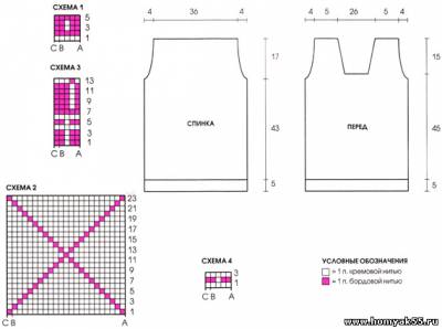 Бордовой нитью набрать 86 петель и связать 4 ряда двойной резинкой и 10 рядов резинкой 2 х 2. Далее вязать лиц. гладью, равномерно убавив в 1-м ряду 8 петель. Начиная с 15-го ряда вязать лиц. гладью жаккардовым узором по схеме 1, по схеме 2 и по схеме 3. Затем связать 12 рядов лиц. гладью бордовой нитью и вязать жаккардовым узором по схеме 4. Далее до конца вязать лиц. гладью только бордовой нитью, через 48 см от наборного края для скосов пройм закрыть с обеих сторон 1 х 6 петель, затем убавлять с обеих сторон в каждом ряду 4 х 1 петле. Через 65 см от наборного края закрыть оставшиеся 58 петель, из которых по 10 петель для каждого плеча.