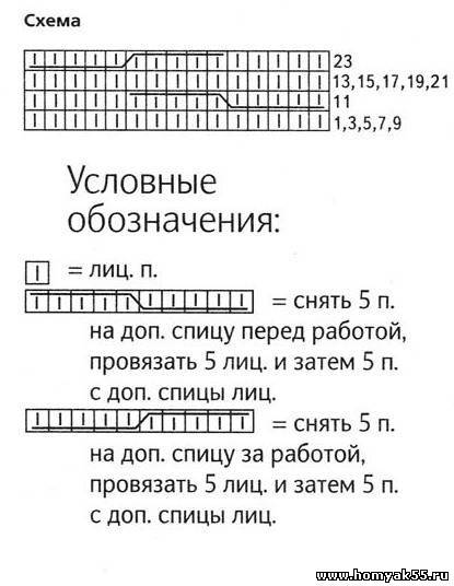 Коса: вяжите по схеме, на которой приведены только лиц. ряды, в изн. рядах все петли вяжите изнаночными.