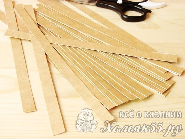 Край корзинки приобрел более завершенный вид. Поделка практически готова, осталось только обработать внутри и присоединить ручку. Для этого нарезаем необходимое количество коротеньких полосок длиной 5-6 см.