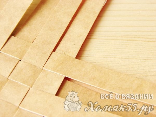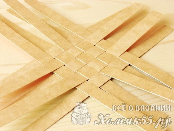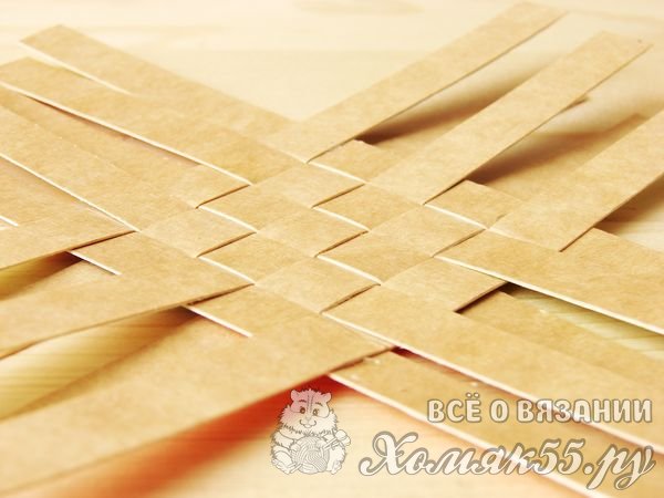 Теперь, когда все детали готовы приступаем к сборке корзинки. Начнем плетение с донышка. Берем первые пять полосок, и раскладываем их, как показано на фото.