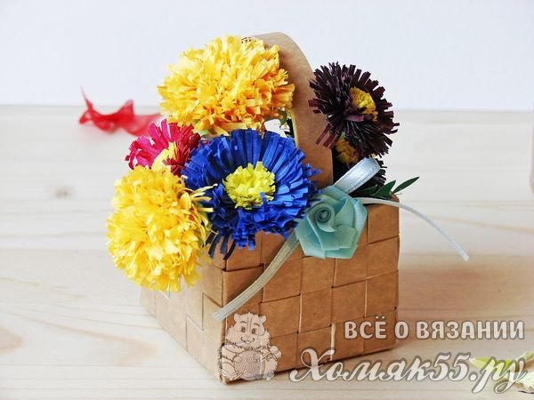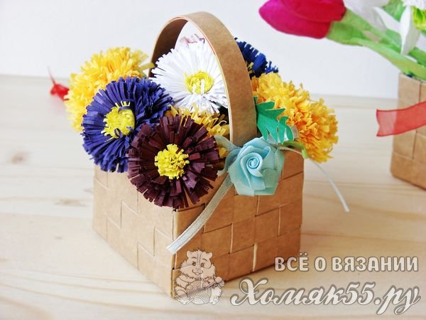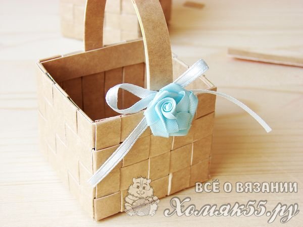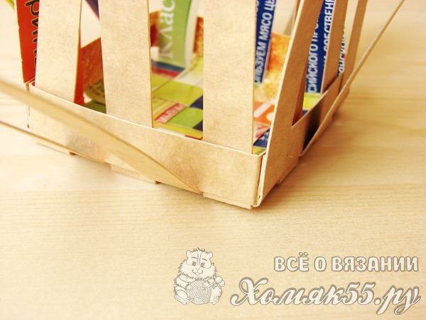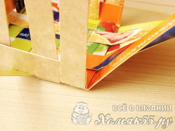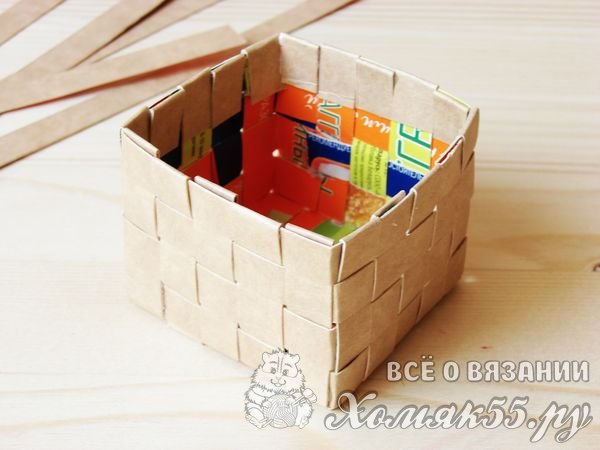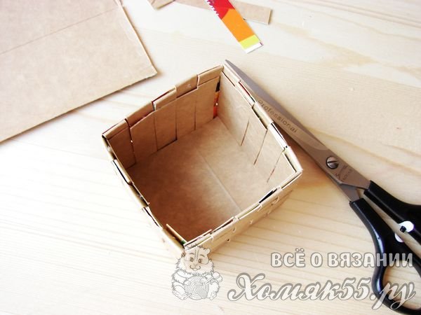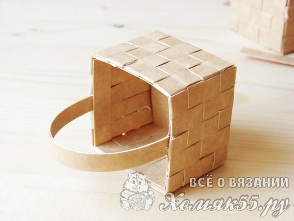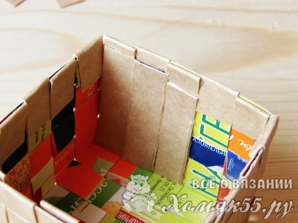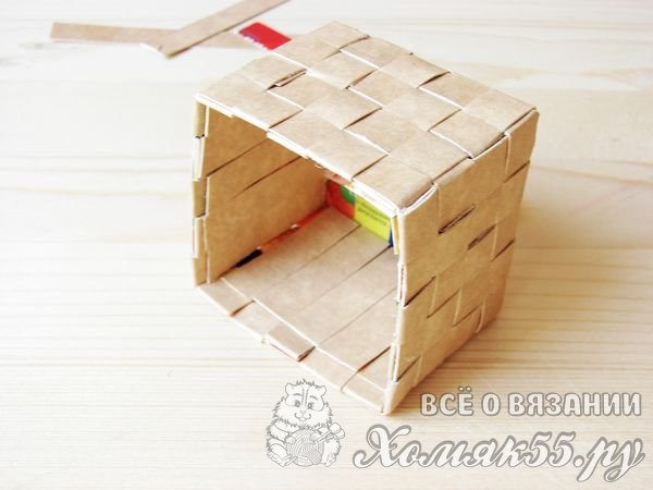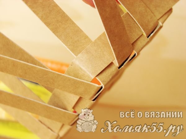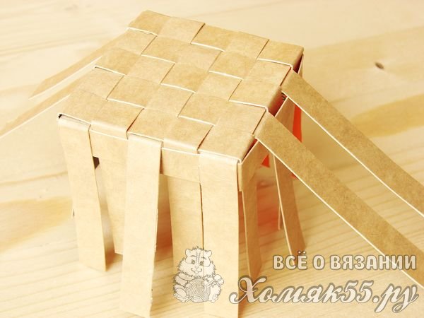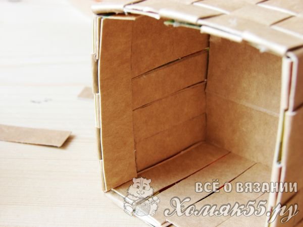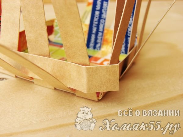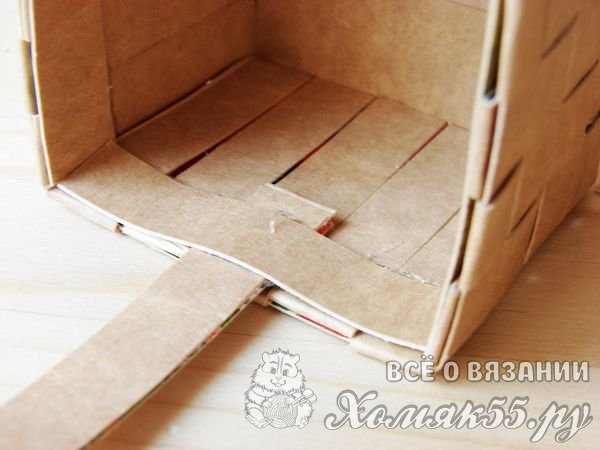 Завершить ее плетение очень просто! Кончики верхних полосок сгибаем вовнутрь поделки. Далее наносим на их внутреннюю сторону немного клея и приклеиваем их к стенке.