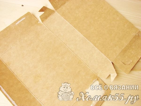 Для начала нам необходимо разложить коробку, разрезав все склеенные участки. Обрезаем лишние кусочки картонной основы.
