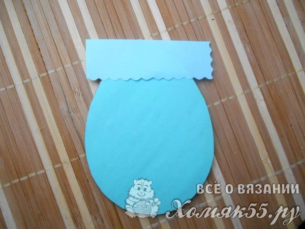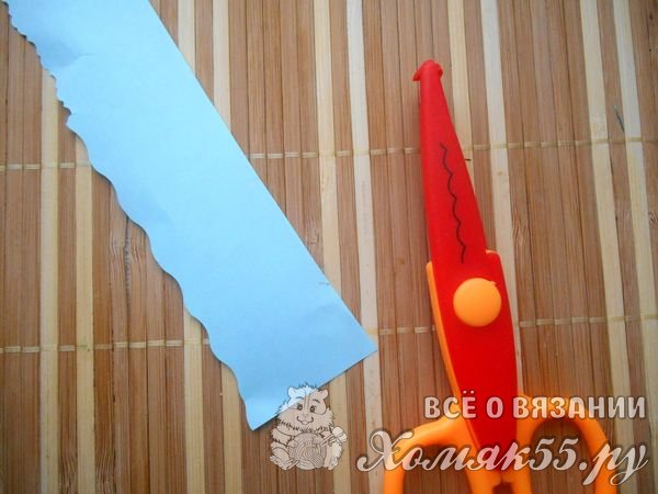 Из синей бумаги с помощью гофрированных ножниц вырезаем деталь, как на фото №5.