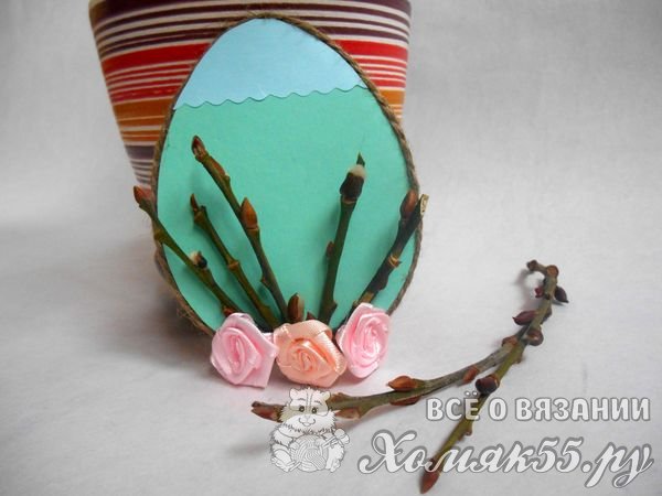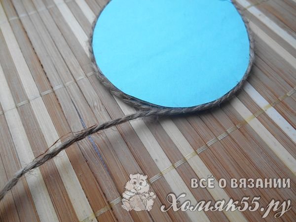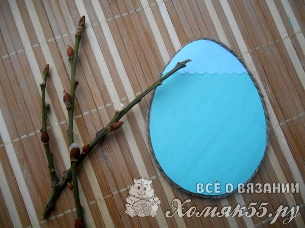 Края яичка обрабатываем бечевкой. приклеиваем ее по всему контуру с помощью клеящего пистолета.